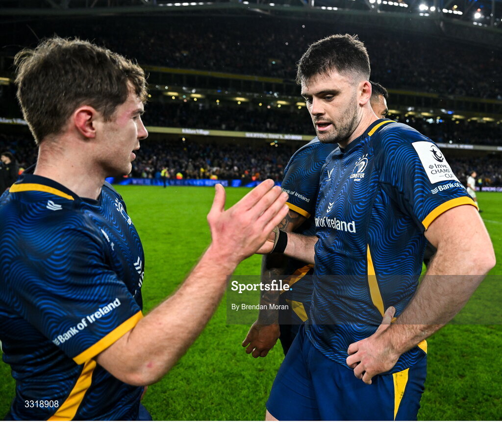 10 January 2026; Harry Byrne celebrates with Leinster team-mate Luke McGrath, left, after the Investec Champions Cup match between Leinster and La Rochelle at the Aviva Stadium in Dublin. Photo by Brendan Moran/Sportsfile