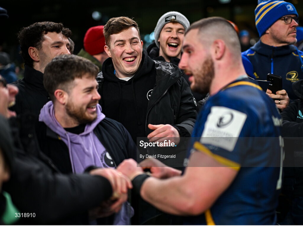 10 January 2026; Jerry Cahir of Leinster and supporters after the Investec Champions Cup match between Leinster and La Rochelle at the Aviva Stadium in Dublin. Photo by David Fitzgerald/Sportsfile