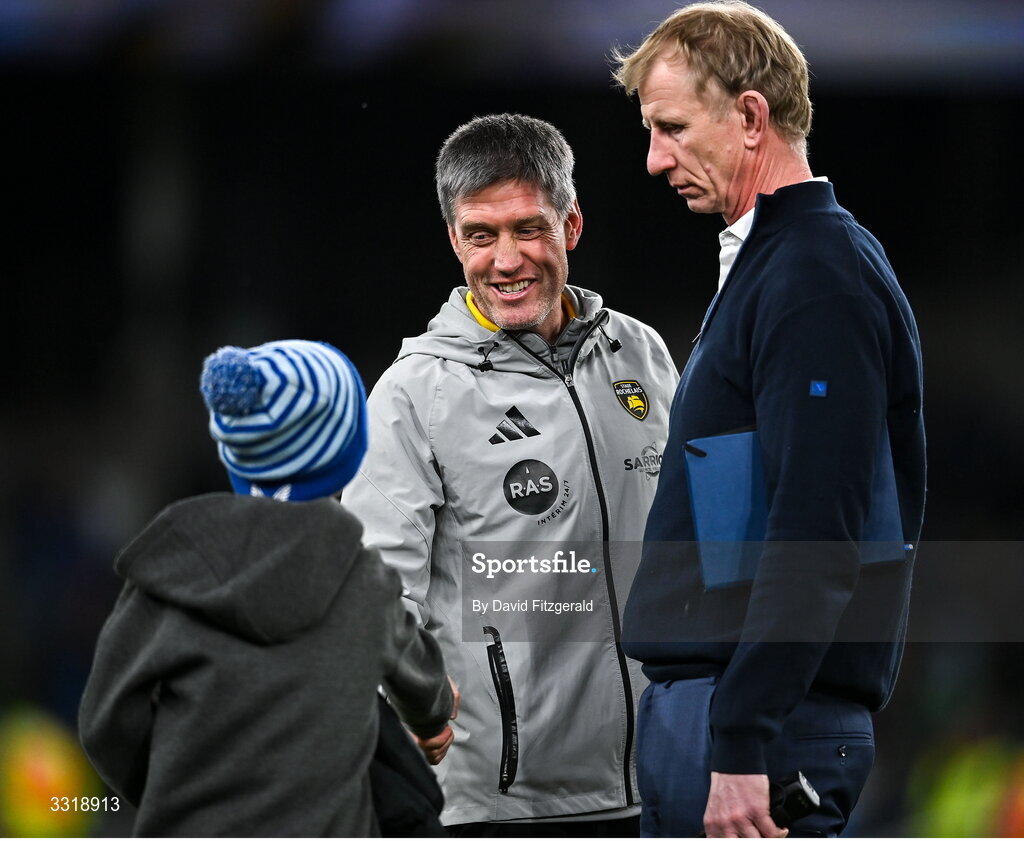 10 January 2026; La Rochelle head coach Ronan O'Gara shakes hands with Con Cullen, son of Leinster head coach Leo Cullen, right, during the Investec Champions Cup match between Leinster and La Rochelle at the Aviva Stadium in Dublin. Photo by David Fitzgerald/Sportsfile