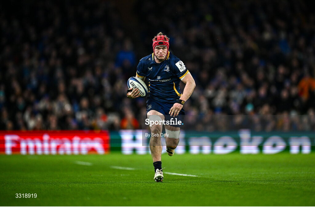 10 January 2026; Josh van der Flier of Leinster on his way to scoring his side's third tryduring the Investec Champions Cup match between Leinster and La Rochelle at the Aviva Stadium in Dublin. Photo by Seb Daly/Sportsfile