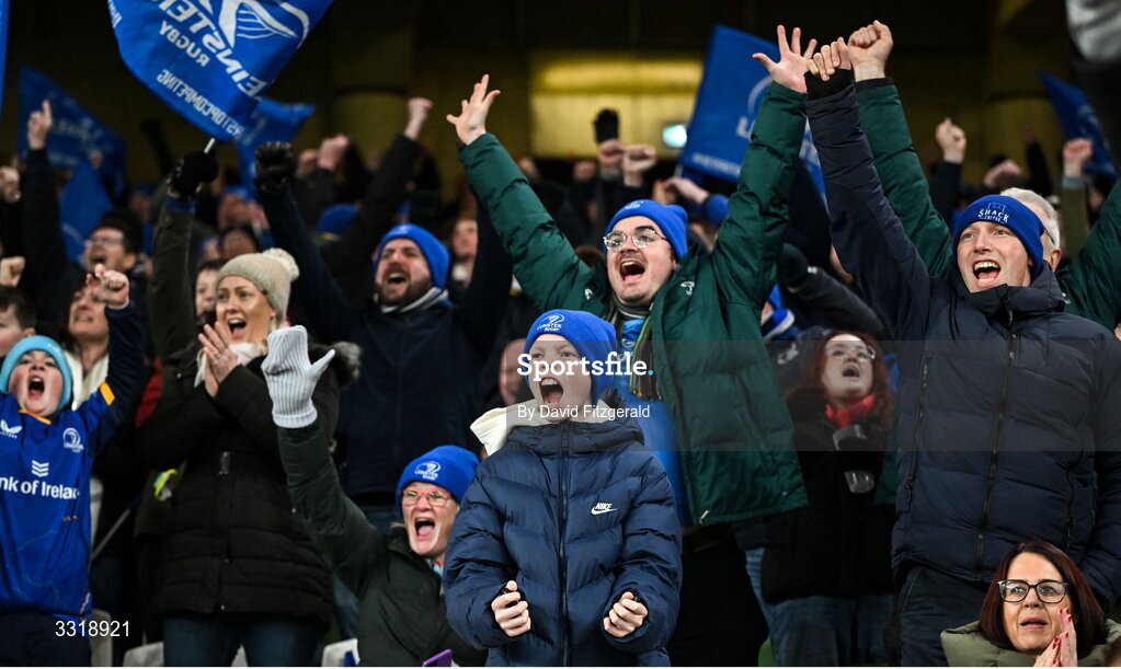 10 January 2026; Leinster supporters celebrates their fourth try during the Investec Champions Cup match between Leinster and La Rochelle at the Aviva Stadium in Dublin. Photo by David Fitzgerald/Sportsfile