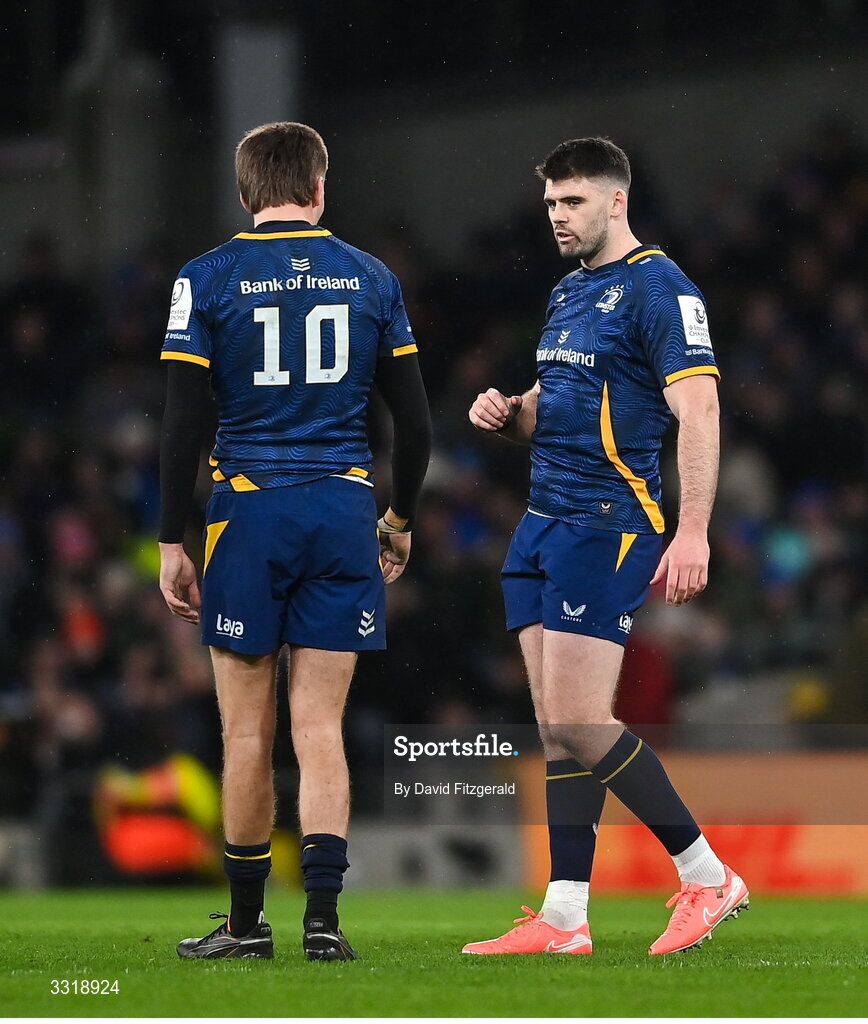 10 January 2026; Harry Byrne, right, and Sam Prendergast of Leinster during the Investec Champions Cup match between Leinster and La Rochelle at the Aviva Stadium in Dublin. Photo by David Fitzgerald/Sportsfile