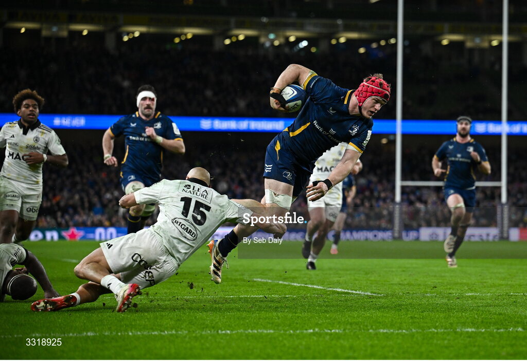 10 January 2026; Josh van der Flier of Leinster evades the tackle of Dillyn Leyds of La Rochelle on his way to scoring his side's third try during the Investec Champions Cup match between Leinster and La Rochelle at the Aviva Stadium in Dublin. Photo by Seb Daly/Sportsfile