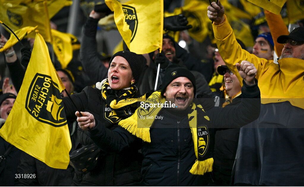 10 January 2026; La Rochelle supporters celebrate their side's second try during the Investec Champions Cup match between Leinster and La Rochelle at the Aviva Stadium in Dublin. Photo by Seb Daly/Sportsfile