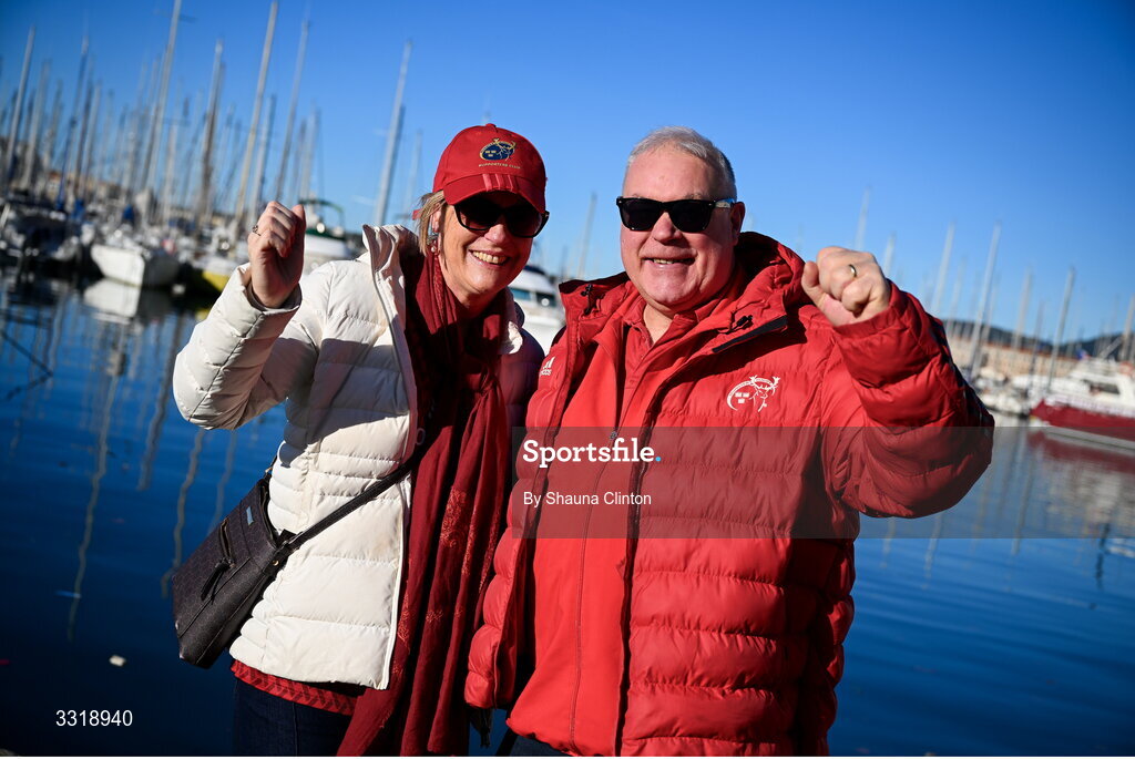11 January 2026; Munster supporters Fionnuala, left, and Adam Gleeson, from Tipperary, before the Investec Champions Cup match between RC Toulon and Munster at Stade Felix Mayol in Toulon, France. Photo by Shauna Clinton/Sportsfile