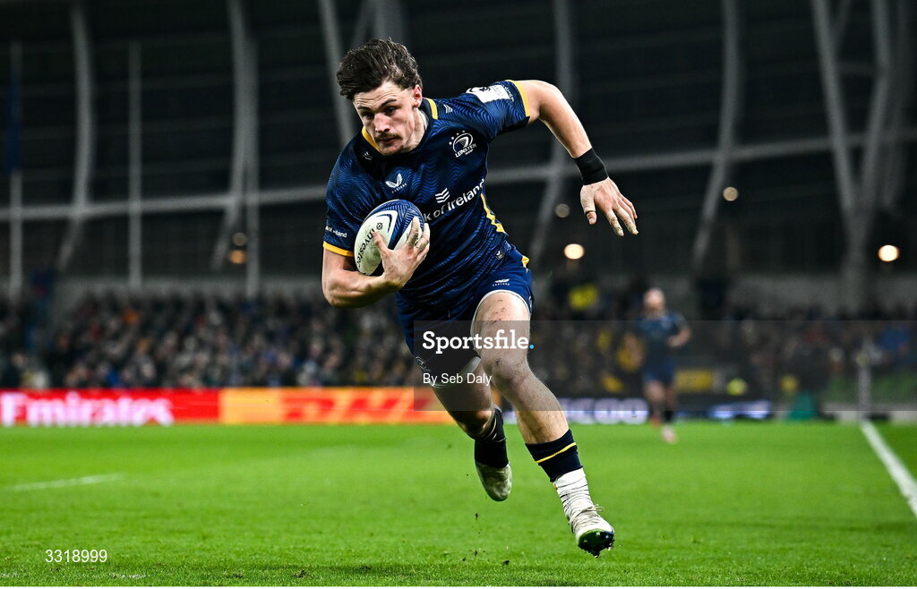 10 January 2026; Joshua Kenny of Leinster on his way to scoring his side's second try during the Investec Champions Cup match between Leinster and La Rochelle at the Aviva Stadium in Dublin. Photo by Seb Daly/Sportsfile