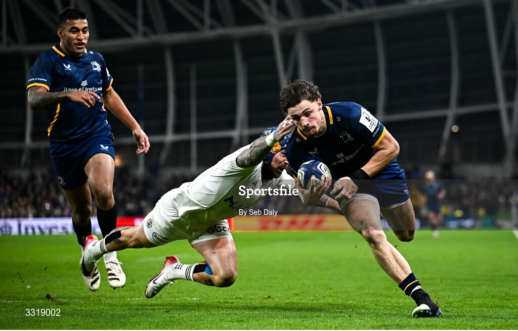 10 January 2026; Joshua Kenny of Leinster on his way to scoring his side's second try during the Investec Champions Cup match between Leinster and La Rochelle at the Aviva Stadium in Dublin. Photo by Seb Daly/Sportsfile