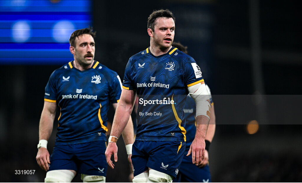 10 January 2026; Leinster players James Ryan, right, and Jack Conan, left, during the Investec Champions Cup match between Leinster and La Rochelle at the Aviva Stadium in Dublin. Photo by Seb Daly/Sportsfile