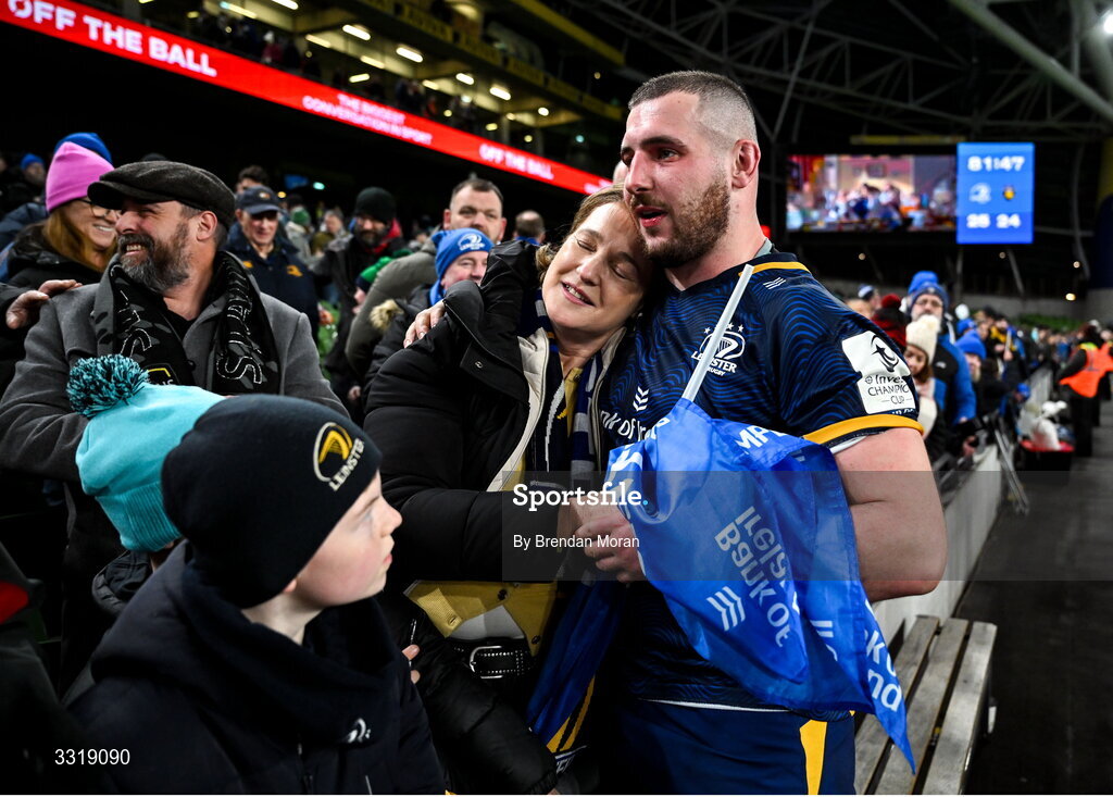 10 January 2026; Jerry Cahir of Leinster celebrates with his mother Julie Fogarty after the Investec Champions Cup match between Leinster and La Rochelle at the Aviva Stadium in Dublin. Photo by Brendan Moran/Sportsfile
