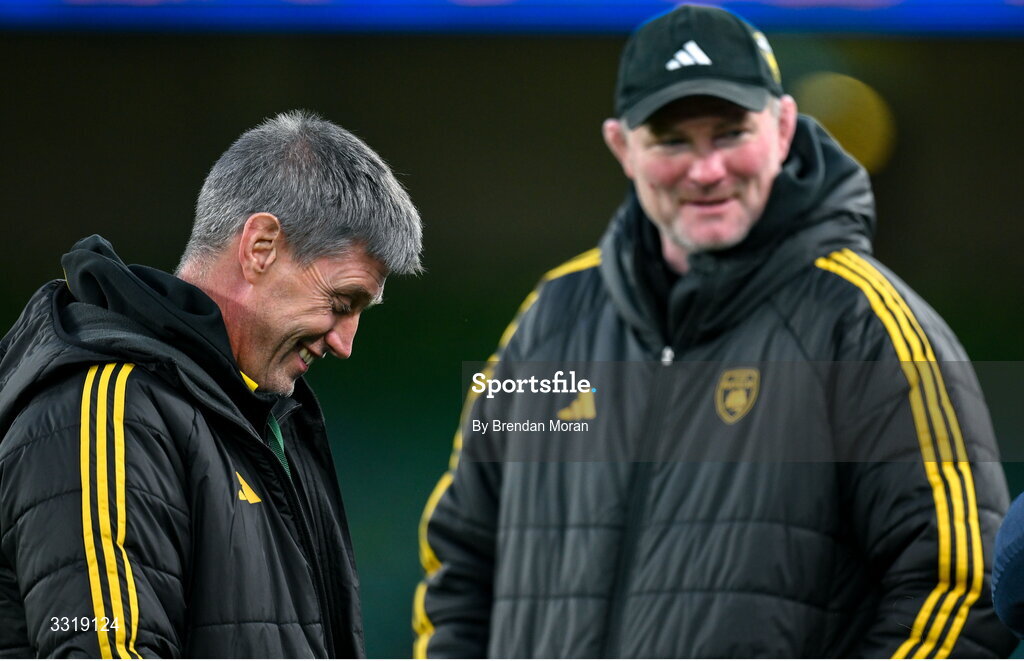 10 January 2026; La Rochelle head coach Ronan O'Gara, left, and forwards coach Donnacha Ryan before the Investec Champions Cup match between Leinster and La Rochelle at the Aviva Stadium in Dublin. Photo by Brendan Moran/Sportsfile