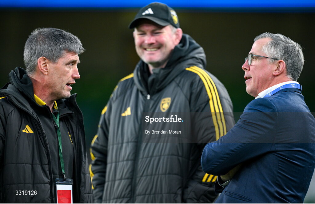 10 January 2026; La Rochelle head coach Ronan O'Gara, left, and forwards coach Donnacha Ryan with Leinster chief operations officer Guy Easterby before the Investec Champions Cup match between Leinster and La Rochelle at the Aviva Stadium in Dublin. Photo by Brendan Moran/Sportsfile