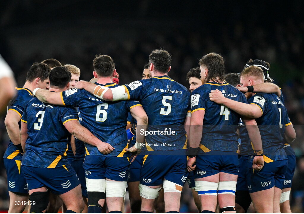 10 January 2026; The Leinster team huddle during the Investec Champions Cup match between Leinster and La Rochelle at the Aviva Stadium in Dublin. Photo by Brendan Moran/Sportsfile