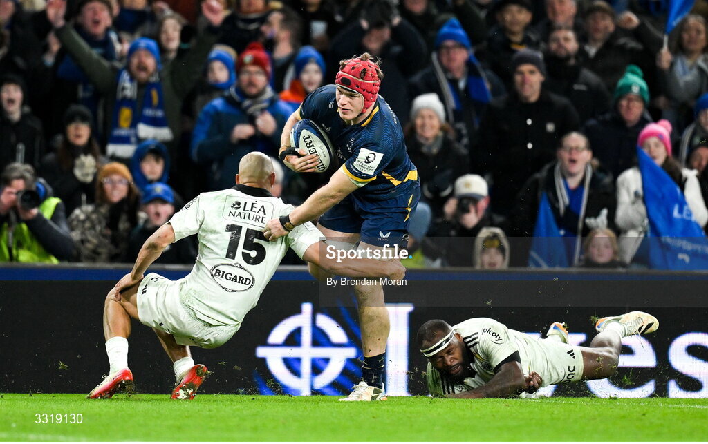 10 January 2026; Josh van der Flier of Leinster beats the tackle of Dillyn Leyds of La Rochelle on the way to scoring hi sside's third try during the Investec Champions Cup match between Leinster and La Rochelle at the Aviva Stadium in Dublin. Photo by Brendan Moran/Sportsfile