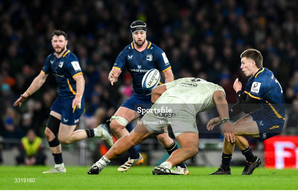 10 January 2026; Sam Prendergast of Leinster passes to teammate Caelan Doris during the Investec Champions Cup match between Leinster and La Rochelle at the Aviva Stadium in Dublin. Photo by Brendan Moran/Sportsfile