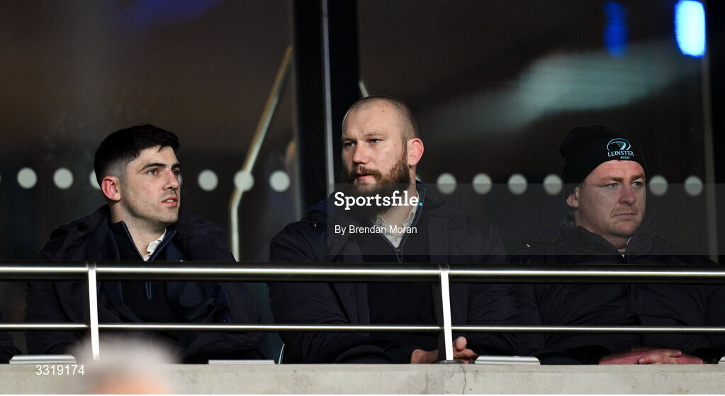 10 January 2026; Leinster players, from left, Jimmy O'Brien, RG Snyman and Tadhg Furlong look on during the Investec Champions Cup match between Leinster and La Rochelle at the Aviva Stadium in Dublin. Photo by Brendan Moran/Sportsfile
