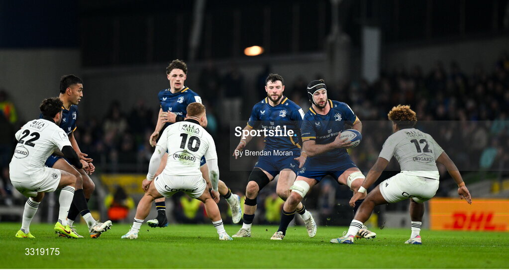 10 January 2026; Caelan Doris of Leinster in action against Simeli Daunivucu of La Rochelle during the Investec Champions Cup match between Leinster and La Rochelle at the Aviva Stadium in Dublin. Photo by Brendan Moran/Sportsfile