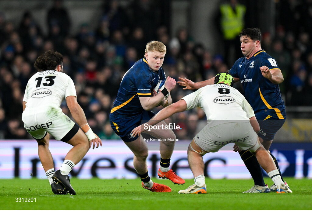 10 January 2026; Andrew Osborne of Leinster in action against Jules Favre, left, and Grégory Alldritt of La Rochelle during the Investec Champions Cup match between Leinster and La Rochelle at the Aviva Stadium in Dublin. Photo by Brendan Moran/Sportsfile