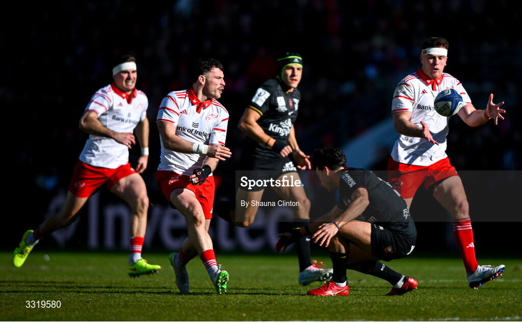 11 January 2026; Calvin Nash of Munster makes a pass to team-mate Tom Farrell during the Investec Champions Cup match between RC Toulon and Munster at Stade Felix Mayol in Toulon, France. Photo by Shauna Clinton/Sportsfile