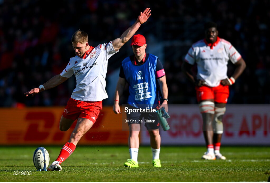 11 January 2026; Jack Crowley of Munster kicks a penalty try during the Investec Champions Cup match between RC Toulon and Munster at Stade Felix Mayol in Toulon, France. Photo by Shauna Clinton/Sportsfile