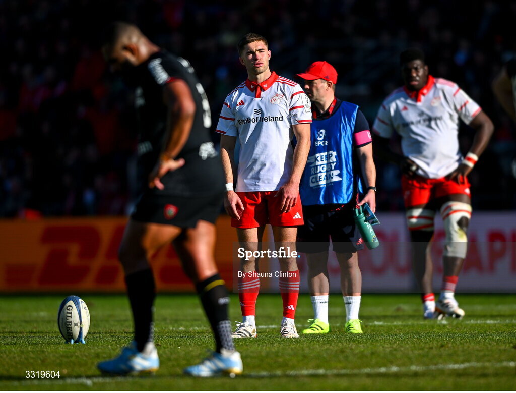 11 January 2026; Jack Crowley of Munster prepares to kick a penalty try during the Investec Champions Cup match between RC Toulon and Munster at Stade Felix Mayol in Toulon, France. Photo by Shauna Clinton/Sportsfile