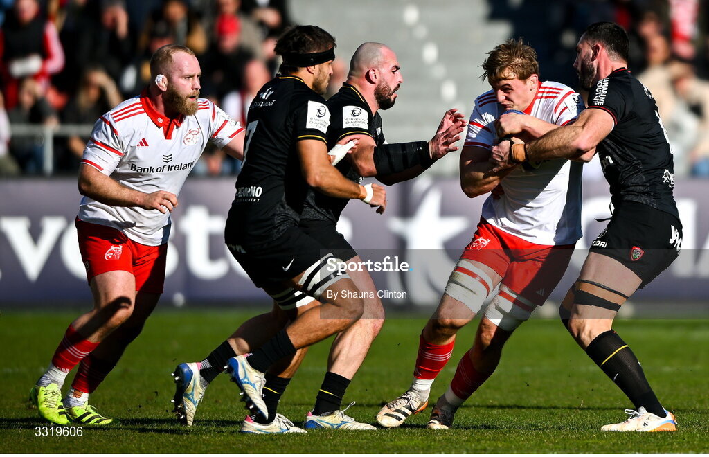 11 January 2026; Gavin Coombes of Munster is tackled by Charles Ollivon of RC Toulon during the Investec Champions Cup match between RC Toulon and Munster at Stade Felix Mayol in Toulon, France. Photo by Shauna Clinton/Sportsfile