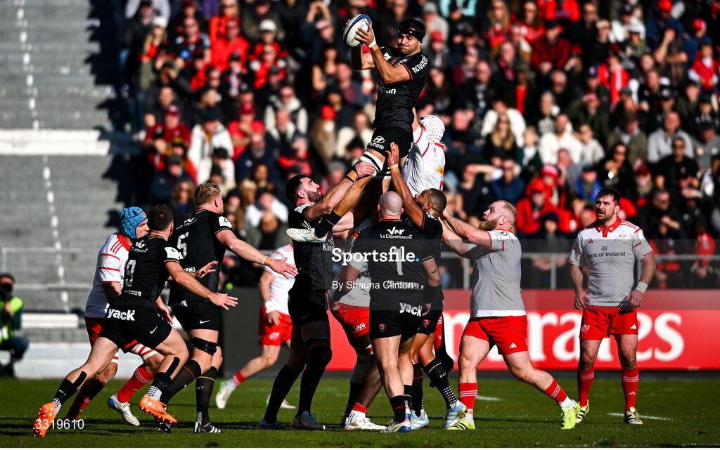 11 January 2026; Esteban Abadie of RC Toulon wins possession in the lineout against Fineen Wycherley of Munster during the Investec Champions Cup match between RC Toulon and Munster at Stade Felix Mayol in Toulon, France. Photo by Shauna Clinton/Sportsfile