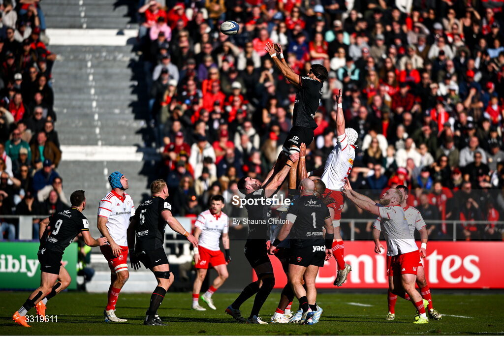 11 January 2026; Esteban Abadie of RC Toulon wins possession in the lineout against Fineen Wycherley of Munster during the Investec Champions Cup match between RC Toulon and Munster at Stade Felix Mayol in Toulon, France. Photo by Shauna Clinton/Sportsfile