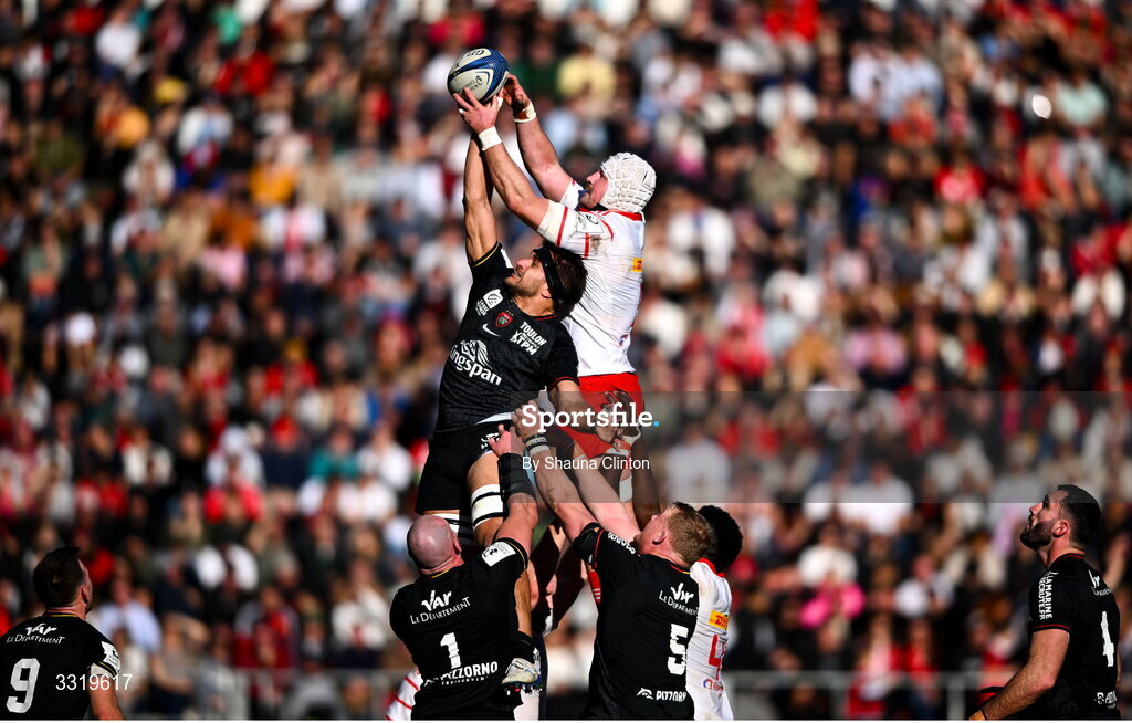 11 January 2026; Fineen Wycherley of Munster wins possession in the lineout against Esteban Abadie of RC Toulon during the Investec Champions Cup match between RC Toulon and Munster at Stade Felix Mayol in Toulon, France. Photo by Shauna Clinton/Sportsfile