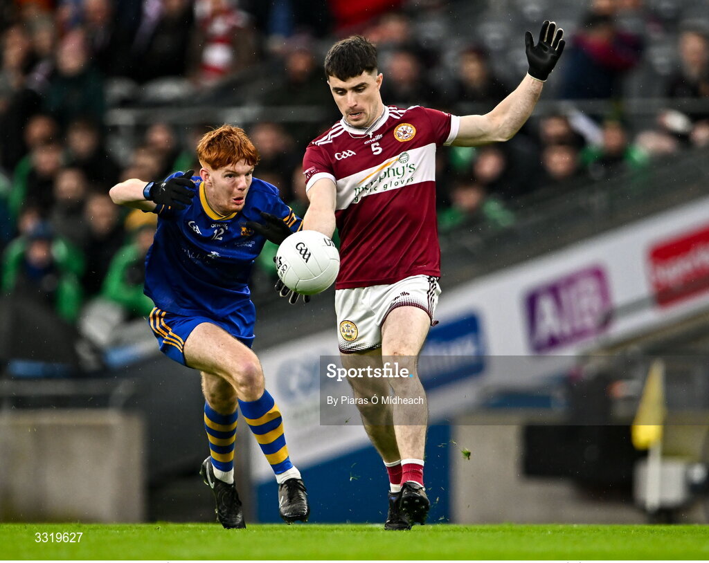 11 January 2026; Conor Shields of Clogher Eire Óg in action against Jack Joy of Ballymacelligott during the AIB GAA Football Junior Club Championship final match between Ballymacelligott of Kerry and Clogher Éire Óg of Tyrone at Croke Park in Dublin. Photo by Piaras Ó Mídheach/Sportsfile