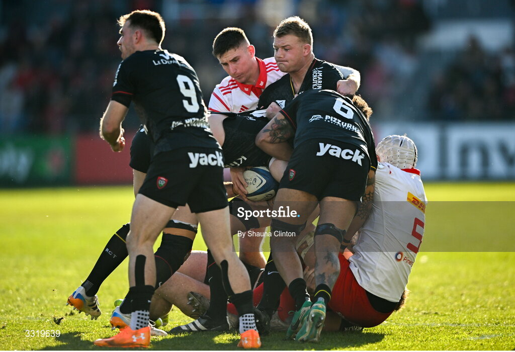 11 January 2026; David Ribbans of RC Toulon is tackled by Munster players Ben O'Connor, left, and Fineen Wycherley during the Investec Champions Cup match between RC Toulon and Munster at Stade Felix Mayol in Toulon, France. Photo by Shauna Clinton/Sportsfile