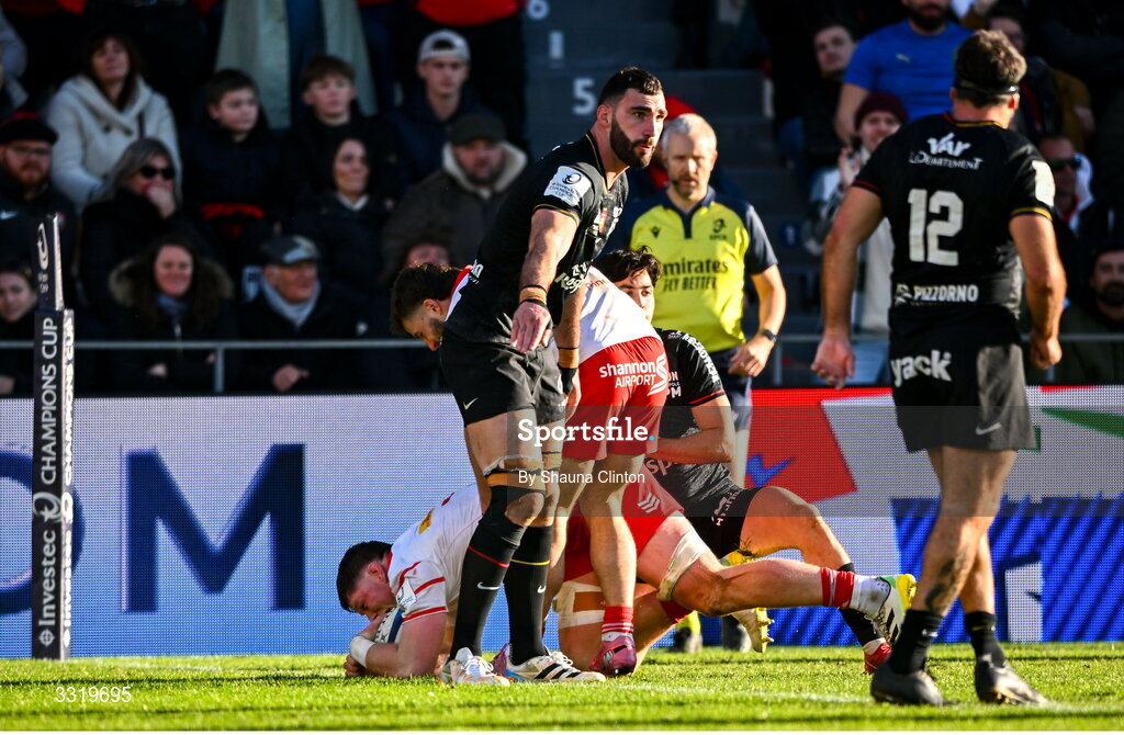 11 January 2026; Jack O'Donoghue of Munster scores his side's second try during the Investec Champions Cup match between RC Toulon and Munster at Stade Felix Mayol in Toulon, France. Photo by Shauna Clinton/Sportsfile