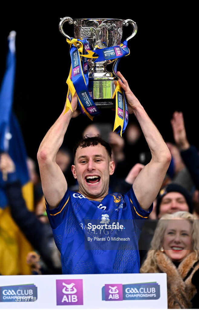 11 January 2026; Ballymacelligott captain Daire Keane lifts the cup after his side's victory in the AIB GAA Football Junior Club Championship final match between Ballymacelligott of Kerry and Clogher Eire Óg of Tyrone at Croke Park in Dublin. Photo by Piaras Ó Mídheach/Sportsfile