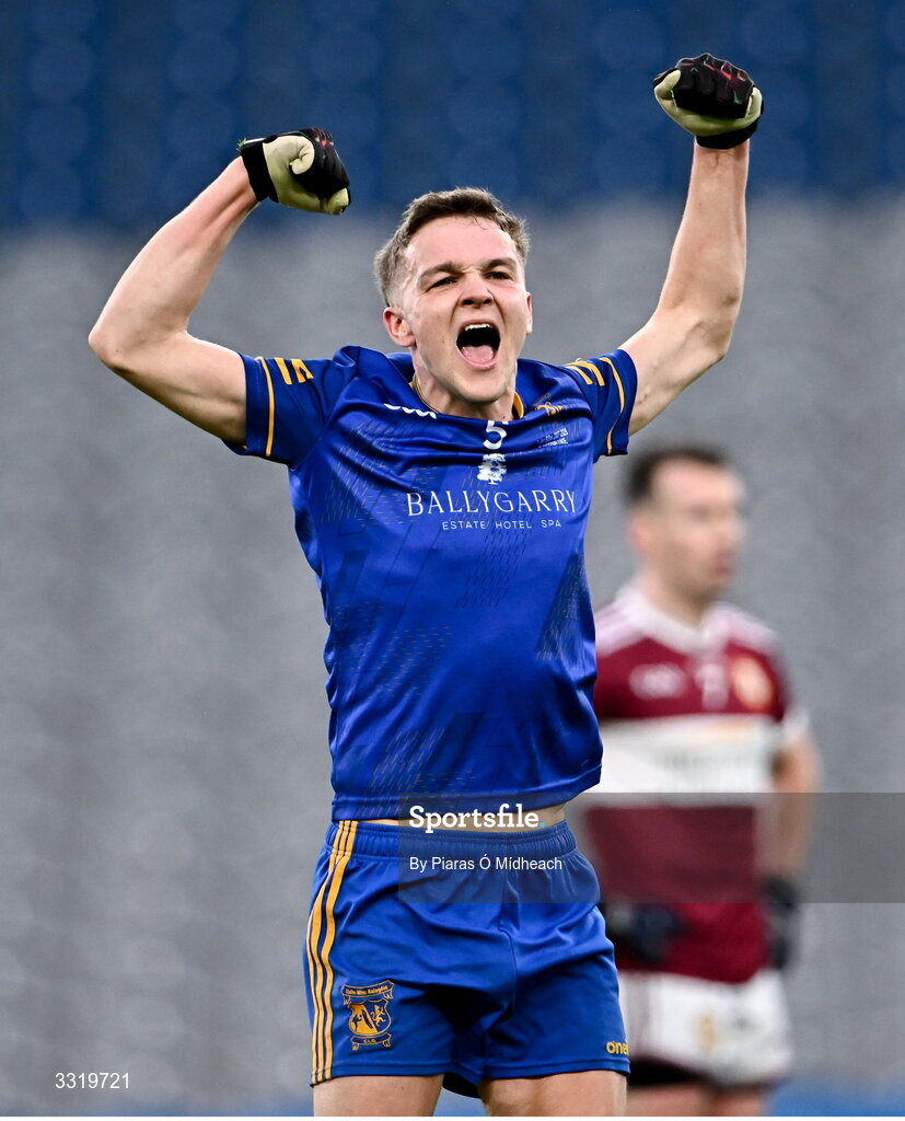11 January 2026; Cathal Dunne of Ballymacelligott celebrate after his side's victory in the AIB GAA Football Junior Club Championship final match between Ballymacelligott of Kerry and Clogher Eire Óg of Tyrone at Croke Park in Dublin. Photo by Piaras Ó Mídheach/Sportsfile