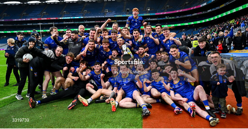 11 January 2026; Ballymacelligott players and coaches celebrate with the cup after their side's victory in the AIB GAA Football Junior Club Championship final match between Ballymacelligott of Kerry and Clogher Eire Óg of Tyrone at Croke Park in Dublin. Photo by Piaras Ó Mídheach/Sportsfile