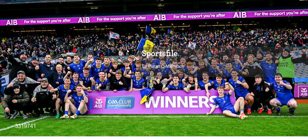 11 January 2026; Ballymacelligott players and coaches celebrate with the cup after their side's victory in the AIB GAA Football Junior Club Championship final match between Ballymacelligott of Kerry and Clogher Eire Óg of Tyrone at Croke Park in Dublin. Photo by Piaras Ó Mídheach/Sportsfile