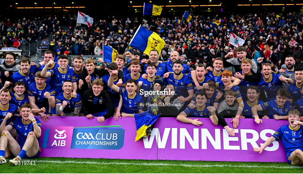 11 January 2026; Ballymacelligott players and coaches celebrate with the cup after their side's victory in the AIB GAA Football Junior Club Championship final match between Ballymacelligott of Kerry and Clogher Eire Óg of Tyrone at Croke Park in Dublin. Photo by Piaras Ó Mídheach/Sportsfile