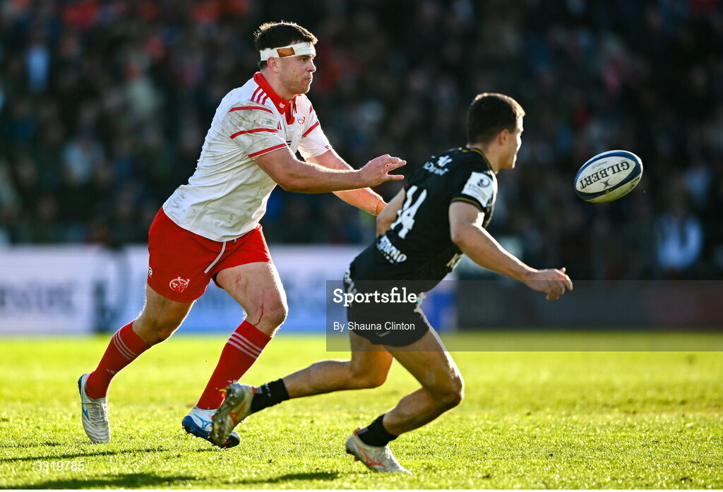 11 January 2026; Tom Farrell of Munster in action against Gaël Dréan of RC Toulon during the Investec Champions Cup match between RC Toulon and Munster at Stade Felix Mayol in Toulon, France. Photo by Shauna Clinton/Sportsfile