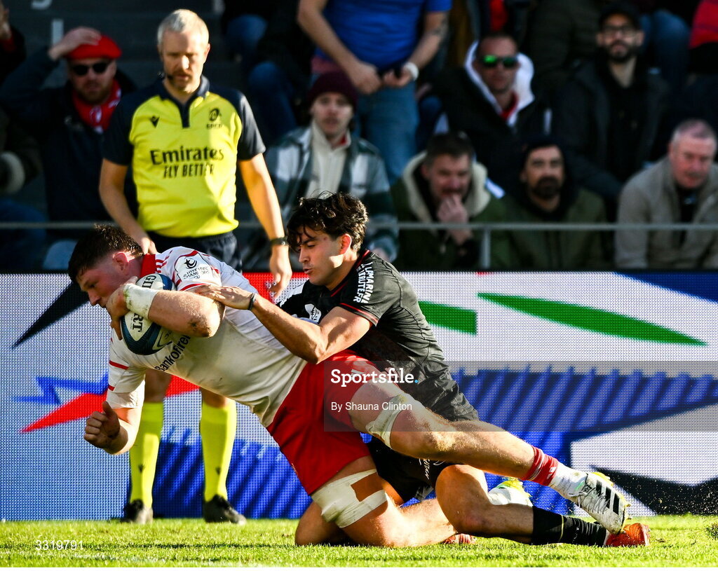 11 January 2026; Jack O'Donoghue of Munster scores his side's second try during the Investec Champions Cup match between RC Toulon and Munster at Stade Felix Mayol in Toulon, France. Photo by Shauna Clinton/Sportsfile