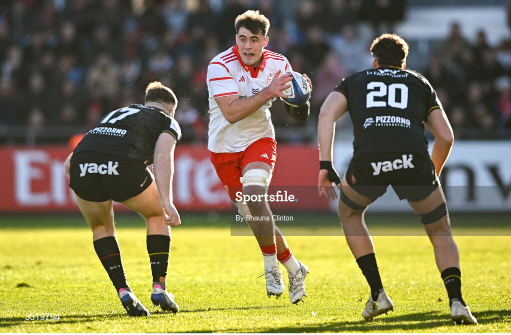 11 January 2026; Brian Gleeson of Munster in action against RC Toulon players Leo Ametlla, left, and Corentin Mezou during the Investec Champions Cup match between RC Toulon and Munster at Stade Felix Mayol in Toulon, France. Photo by Shauna Clinton/Sportsfile