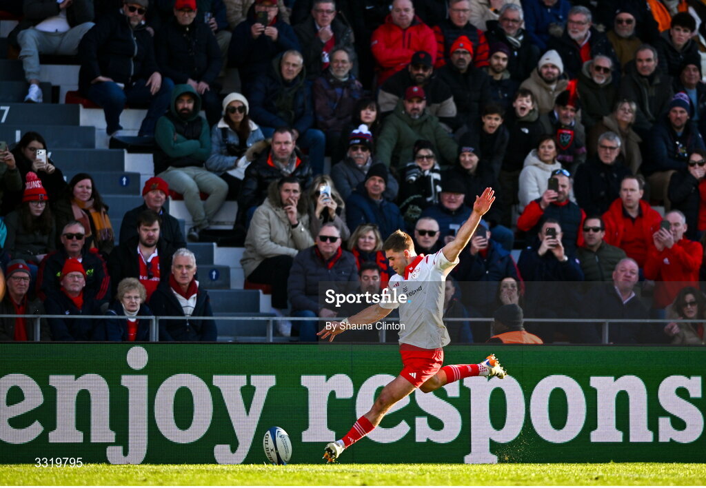 11 January 2026; Jack Crowley of Munster kicks a conversion during the Investec Champions Cup match between RC Toulon and Munster at Stade Felix Mayol in Toulon, France. Photo by Shauna Clinton/Sportsfile