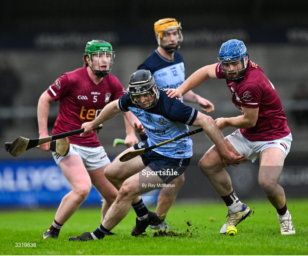 11 January 2026; Cian O'Sullivan of Dublin is tackled by Conor McKeogh and Brian McCabe of Westmeath, left, during the Dioralyte Walsh Cup semi-final match between Dublin and Westmeath at Parnell Park in Dublin. Photo by Ray McManus/Sportsfile
