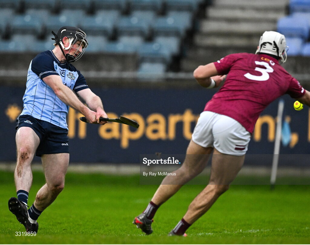 11 January 2026; Cian O'Sullivan of Dublin shoots past the Westmeath full-back Conor Shaw to score the first goal, in the 8th minute, during the Dioralyte Walsh Cup semi-final match between Dublin and Westmeath at Parnell Park in Dublin. Photo by Ray McManus/Sportsfile