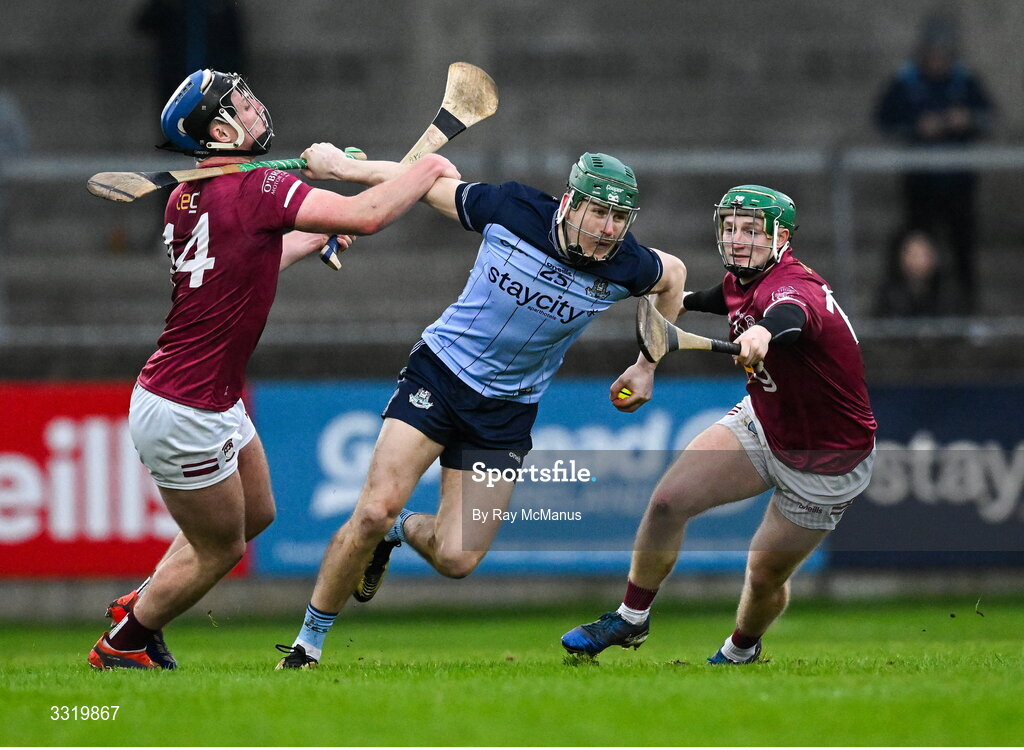 11 January 2026; James Madden of Dublin is tackled by Darragh McCormack, left, and David Williams of Westmeath during the Dioralyte Walsh Cup semi-final match between Dublin and Westmeath at Parnell Park in Dublin. Photo by Ray McManus/Sportsfile
