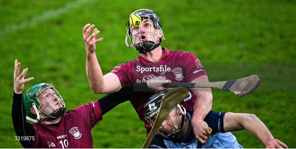 11 January 2026; Darragh McCormack of Westmeath and his team mater David Williams, left, reach for the sliotar with Seán Gallagher of Dublin during the Dioralyte Walsh Cup semi-final match between Dublin and Westmeath at Parnell Park in Dublin. Photo by Ray McManus/Sportsfile