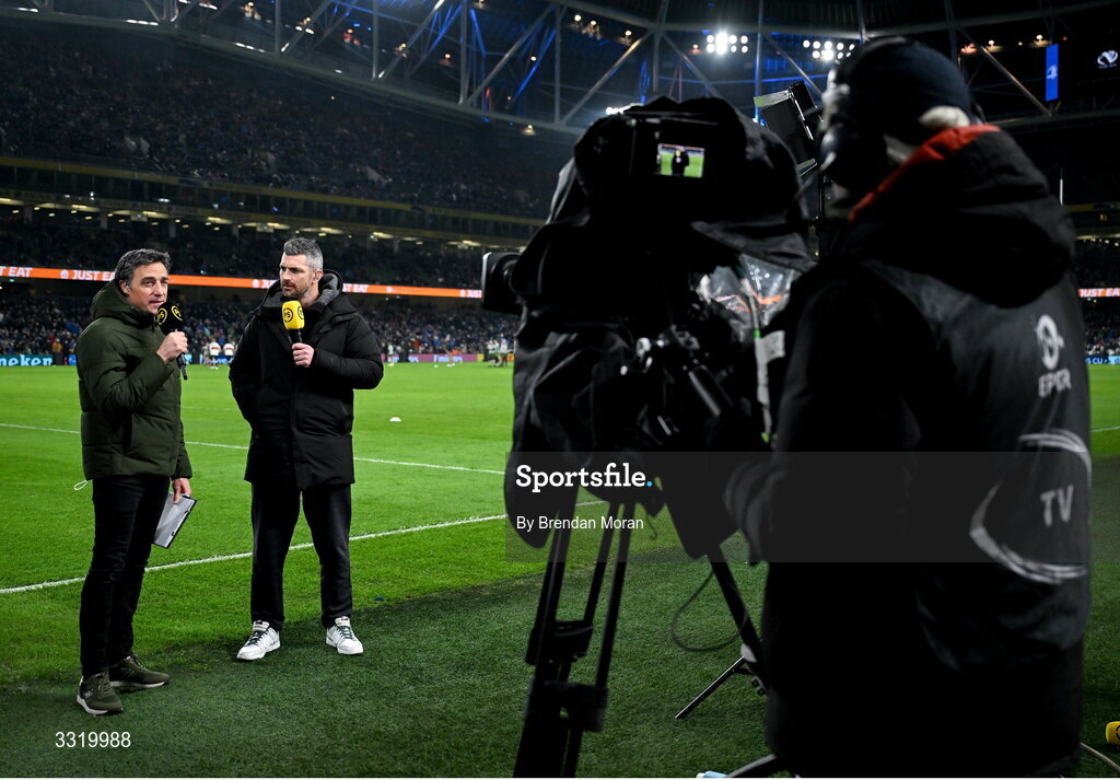 10 January 2026; Premier Sports TV anchor Graham Little, left, with analyst Rob Kearney before the Investec Champions Cup match between Leinster and La Rochelle at the Aviva Stadium in Dublin. Photo by Brendan Moran/Sportsfile