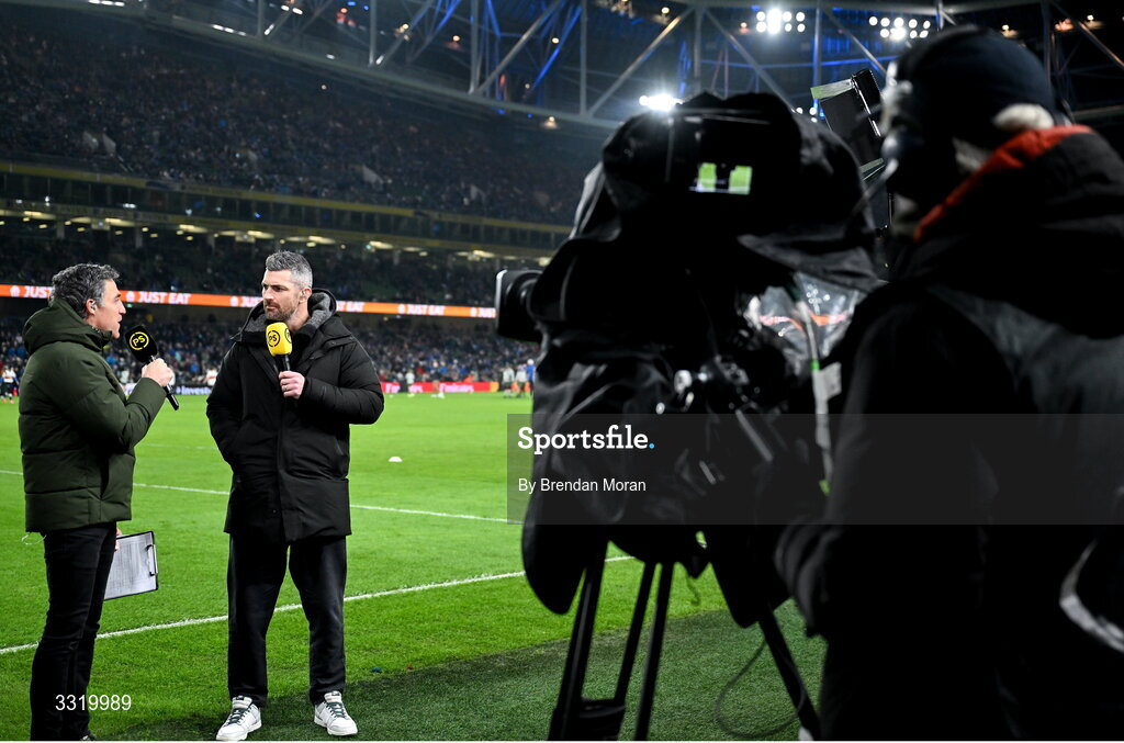10 January 2026; Premier Sports TV anchor Graham Little, left, with analyst Rob Kearney before the Investec Champions Cup match between Leinster and La Rochelle at the Aviva Stadium in Dublin. Photo by Brendan Moran/Sportsfile