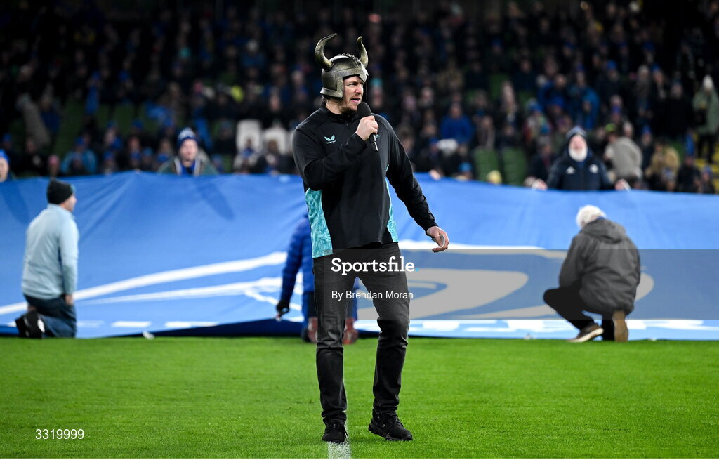10 January 2026; Hype man Mike McCarthy before the Investec Champions Cup match between Leinster and La Rochelle at the Aviva Stadium in Dublin. Photo by Brendan Moran/Sportsfile