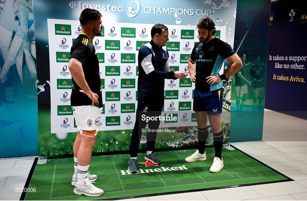 10 January 2026; Referee Matthew Carley performs the coin toss in the company of team captains Grégory Alldritt of La Rochelle, left, and Caelan Doris of Leinster before the Investec Champions Cup match between Leinster and La Rochelle at the Aviva Stadium in Dublin. Photo by Brendan Moran/Sportsfile
