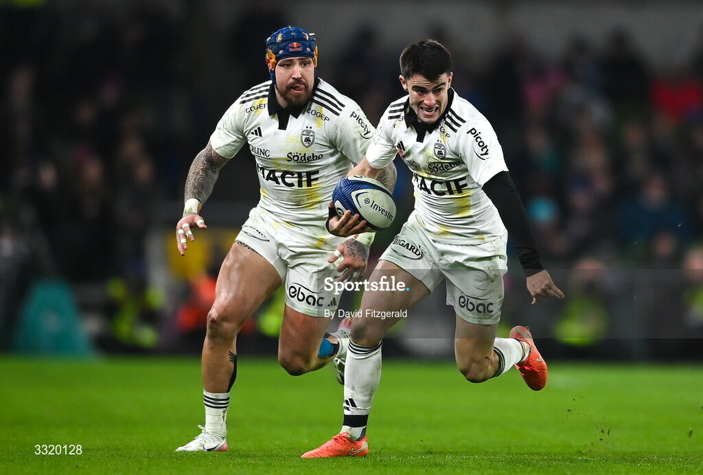 10 January 2026; Nolann le Garrec, right, and Jack Nowell of La Rochelle during the Investec Champions Cup match between Leinster and La Rochelle at the Aviva Stadium in Dublin. Photo by David Fitzgerald/Sportsfile Photo by David Fitzgerald/Sportsfile