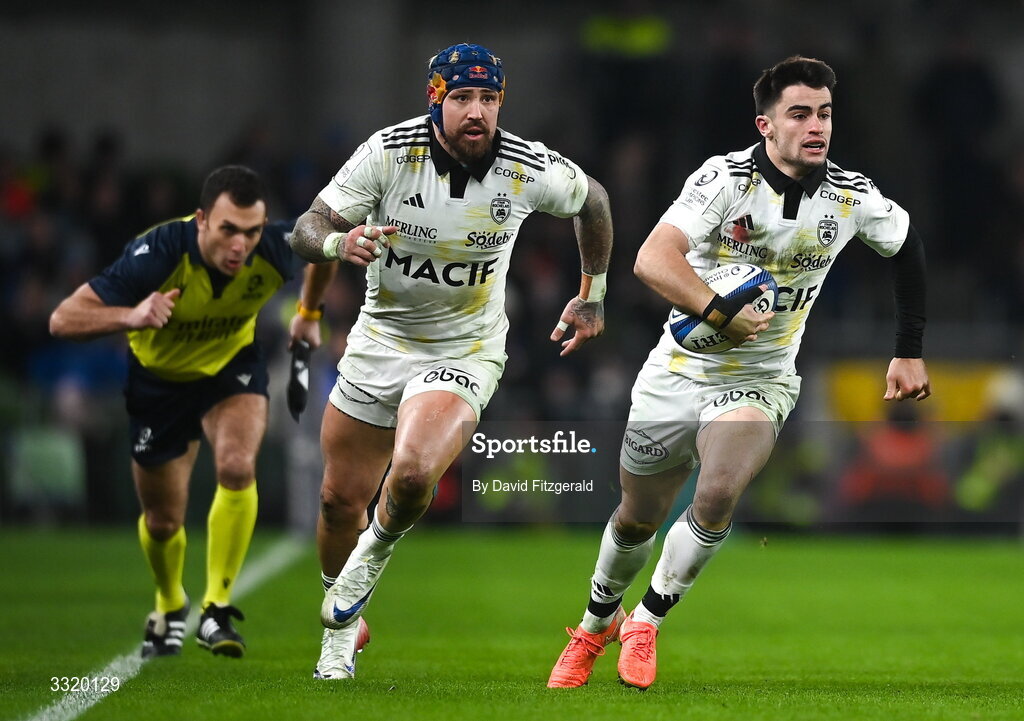 10 January 2026; Nolann le Garrec, right, and Jack Nowell of La Rochelle during the Investec Champions Cup match between Leinster and La Rochelle at the Aviva Stadium in Dublin. Photo by David Fitzgerald/Sportsfile Photo by David Fitzgerald/Sportsfile